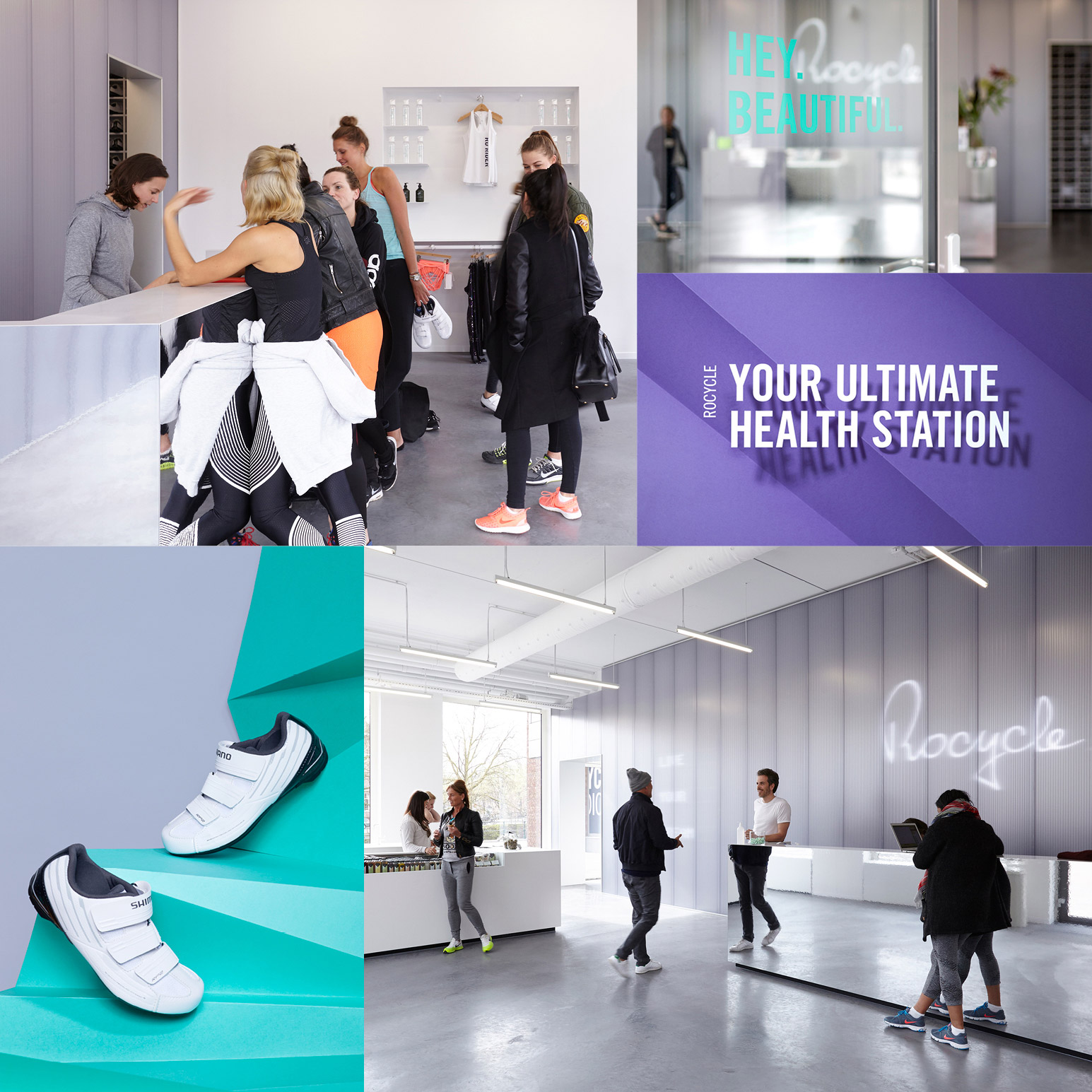 In schril contrast met de donkere fietszaal is de rest van het pand gehuld in een clean design. Wit, helderpaars en knallend mintgroen voeren de boventoon. Zo krijgt het concept een open en creatieve uitstraling. Rocycle wil namelijk dat mensen zich thuis voelen in de groep, je een boost krijgt wanneer je er bent.
