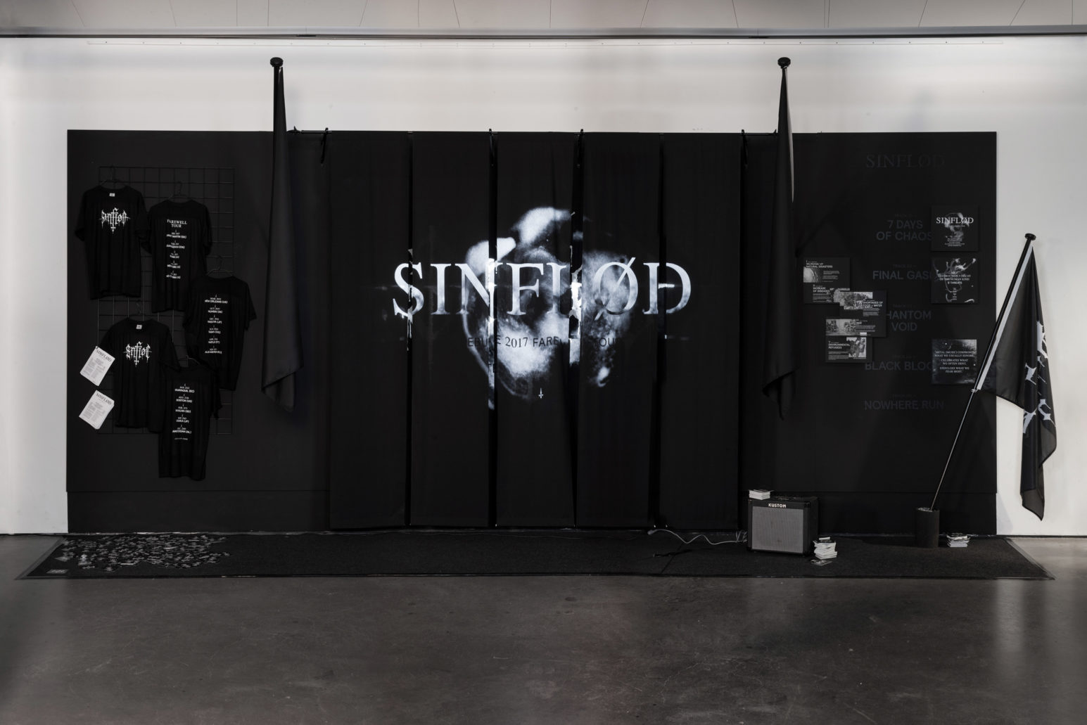 Tijdens het Graphic Matters festival toonde Sinflød zich voor het eerst aan het publiek, in de vorm van een installatie. De geënsceneerde setting van een merch-stand & podium sprak tot de verbeelding. Met deze vorm bevragen we de gebruikelijke manier waarop de oorzaken en gevolgen van de klimaatproblematiek veelal worden weergegeven.